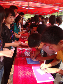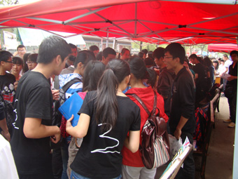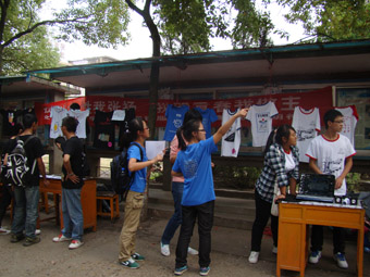 本届“班服设计大赛”的通知已于9月22日就下达到11级各新生班级。一个月以来,同学们集思广益,团结协作,共同用心编织起属于他们自己班级的个性服装。有的简约新奇,有的活泼飘逸,有的庄重大方。摆点活动现场到处都是身着班服的新生身影,有的在忙碌搬桌椅,有的在忙着张贴海报,更有甚者已经堵在了门口等待学姐学长们下课为本班班服投票。现场每个班级分别展示班服的正面和背面,班服多以黑白为主,但简约大方,又不失青春活力。电视机、话筒、脚印,独具匠心的创意让每件班服看起来都活泼新颖、富有特色。