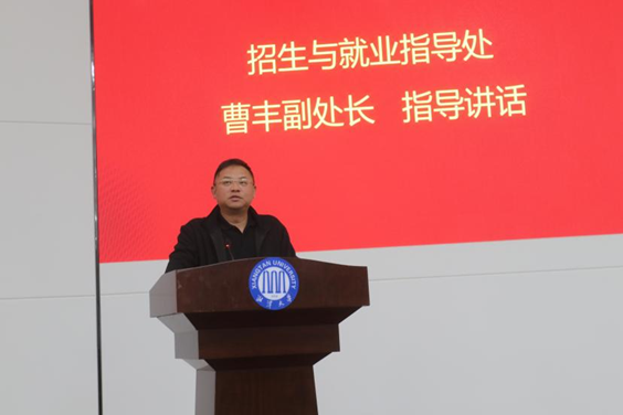 招生与就业指导处副处长曹丰结合学院专业特点与历年数据,深入分析当前考研与就业严峻形势。他以“超1270万人同台竞技”警示学生,拆解考研调剂收紧、文科专业缩招、实习就业错位三大困境,并给出突围建议:考研精准择校,就业提早投递简历,考公预留保底offer。